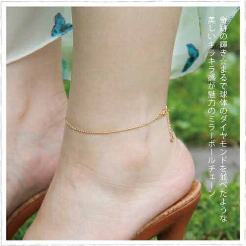 まるで球体のダイヤモンドを並べたような美しいキラキラが魅力のミラーボールチェーン 宝石もついていないのに光を反射して大人っぽい足元を演出する、夏のオシャレに必須のアンクレットは、お洒落に敏感な女性が必ず取り入れているアイテムです。